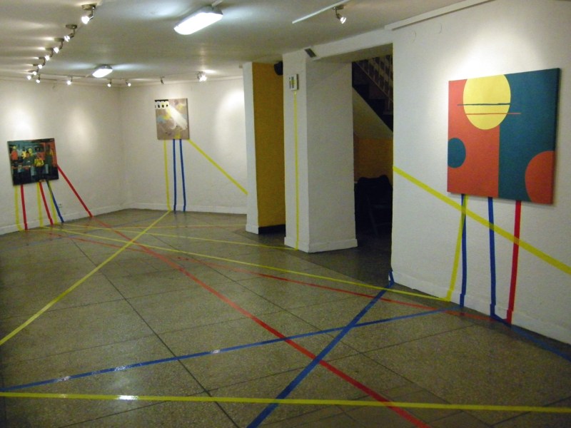 Wróciły prace z mojej indywidualnej wystawy Farbenlehre w Białej Podlaskiej. Z tej okazji kilka fotek ekspozycji, oraz słowo komentarza. Kolory taśm, funkcjonują jako zamienniki słów żółty, czerwony, niebieski, tak że gwiaździsta struktura przez nie utworzona jest jednocześnie opisem relacji barwnych między pracami. Jest też rozlaniem się opisu wystawy na jej przestrzeń.