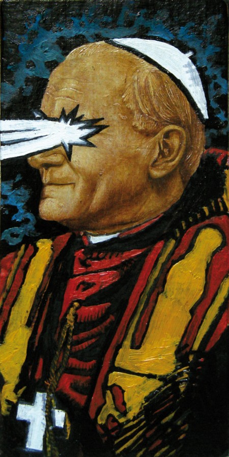 I have gotten a holy picture of John Paul II from an early period, oil on wood, a thing as obvious as panelling or leatherworks. Place of the Polish Pope in the national pantheon of (super) heroes is secure, so I desired to transform his effigy in such a way, so it could appear on other planes of imagination, both collective and individual. The updated version, now as The Invincible, reveals a phenomenon that could have been revealed by someone like Sister Faustyna. John Paul II commands a superpower in the shape of light beams of Truth striking from his eyes. What happens outside of the picture, we can only imagine, although clues left by the Polish Pope suggest that he uses them to have it out with the civilization of death, which obviously doesn’t have light beams of Truth at its disposal.