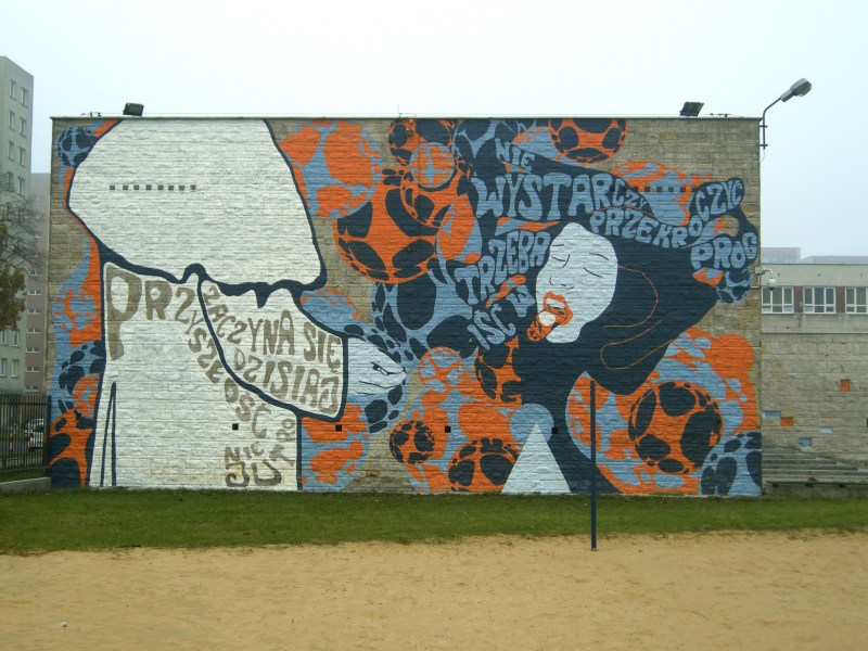 Jakiś czas później dostałem propozycję realizacji wielkoformatowego papieża, na gimnazjum, nomem omen, Jana Pawła II. Wiązały się z tym dwa problemy. Jaka realizacja powinna znaleźć się na budynku instytucji na wskroś opresyjnej, jaką jest szkoła, i jak wejść w dialog z obrazem tak bardzo powielonym – klasyczną wersją wizerunku JP2 (lekko zadumany półprofil z delikatnie marzycielskim i jednocześnie ojcowskim uśmiechem na ustach). Co się stanie jeśli przedstawienie będzie radykalnie inne?