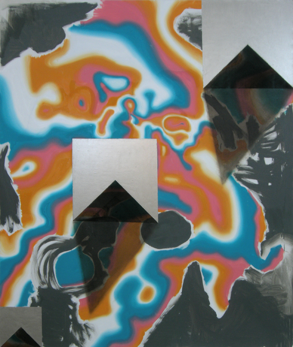 Runny, swirling (movement) multicolored blots of pervasive, intensive, narcotic hues (psychedelic) are overcast with rough borders reminding of a torn paper collage ( torn paper collage), separating stains of dark olivegray paint. It is a mix of colors used by me in the course of last year – I pour together leftovers, after finishing painting. The resulting color (color zero) is my basic one, which I employ to a variety of grounds, overpainting and others. Of course color zero is changeable in time, depending on which paints I use in given time.