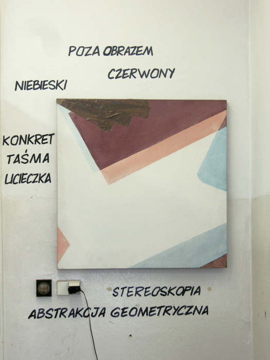 Powyżej fotki ekspozycji – pierwsza, zdjęcie tego, co okazało się być w innym stanie niż płynny, czyli pracy Żywe srebro. Następna, Abstrakcja z zaklejonym fragmentem, zaklejona – tym razem prawdziwą – taśmą pakową. Zbyt mało realistyczną jednak, gdyż ewidentnie nikt nie próbował jej odkleić.