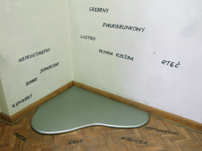 A radical form of artistic critique (so-called critique through action) dominated the last days of exhibition “Sick Art”, luckily steering clear of works by me. The only other type of physical activity, that I have met with during the duration of the show, was a kind of a compliment given by public, that consisted of repeated attempts of treading into a silvery pool spilled on the floor. Acts of little faith, that one can apply homogenous paint so evenly that it appears liquid-like, I find flattering…