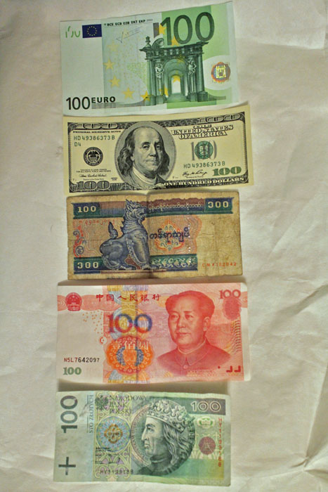 Po powrocie zacząłem porządkować rzeczy przywiezione: nieczytelne lokalne gazety, zdjęcia, birmański gin, fragmenty lokalnej cepelii, kawałek opium ( ha ha, nieprawda..), kilkanaście pomiętych birmańskich banknotów. Ciekawie wygląda zestawienie nominałów setek używanych podczas podróży z różnych państw. Chińskie sto Yuanów zdaje się być najbardziej interesujące, a sto Euro zdecydowanie najmniej udane. Zielony Jagiellon wypada nieźle, w środku stawki. Zacząłem oglądać numery serii: banknoty z Birmy wyglądają często jak wyciągnięte psu z gardła; to dość ciekawe w relacji do tego, że mieszkańcy żądają świeżych zielonych: only crisp dollars, sir, this one no good. I pokazują palcem wskazującym na plamkę wielkości milimetra na rewersie i mówią, że ten nie nadaje się do niczego. Lub nie przyjmują zielonych z serią CB utrzymując, że jest to specjalne oznaczenie pokazujące podrobiony banknot (skrót od Counterfeit Bill).