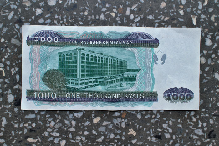 Na banknocie o nominale tysiąca Kyat jest przedstawiony budynek banku centralnego Birmy. Klasyka socmoderny. Nic specjalnego w zasadzie i myśląc o tym, co można umieścić z tyłu banknotu wydał mi się całkiem nudny.