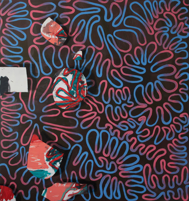 And what do we see? It is a place where the painting touches the surface of speech for the second time. The titular direction of movement appears in a mildly psychedelic abstraction, elements on the left are falling down, and one can expect that some will move up into the painting on the right side. And that the box, which opens up when one is sitting quietly in the room alone, is to be closed by painting. Only so, to open up another one after some time.