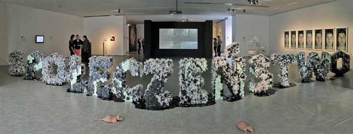 The society is painted black and white. The society is touched upon by a very basic painterly means. At the same moment the meaning of paint-matter undergoes resemantisation, and black becomes tar, white become feathers, the society is tarred and feathered. Publicly. Painting, just like in classical allegorical painting, gives away to the illusion created. Next everything becomes clear. Society is judged and punished accordingly. Society has to make amends.