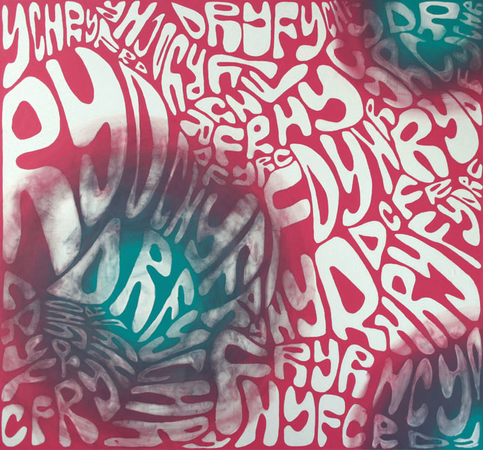 Moim punktem wyjścia jest pokazanie siebie poprzez nieobecność, obrazowanie za pomocą słów (rozszyfrowanie kombinacji liter pozostawiam czytelnikowi..). Jest wyraźna preferencja estetyczna: lejąca się forma i ulubiona kombinacja kolorów dopełniających. A więc turkus i świetlista czerwień. A w lusterku wstecznym historii migoczą układy typograficzne Samuela Szczekacza.