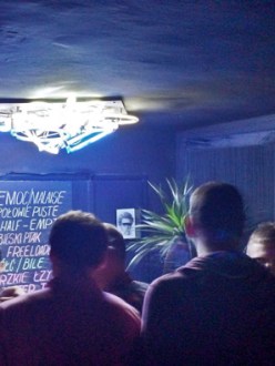 Miejsce dla zawodowych malkontentów: meneli, artystów i filozofów. Zamknięte między hasłami bez wyjścia i bez powrotu, o szyldzie z wyklejonych na ścianie wypalonych petów. Mała pomalowana w depresyjną czerń knajpa, która otwiera się o godzinie, o której Kopciuszek musi już uciekać z baru. Albo: rzeźba do której się wchodzi, lub wraca, ze wszystkim co boli w życiu, niby do chtonicznego łona. Wyposażonego w niezbyt czyste kontuary i bar, wyściełane czarnym papierem […]